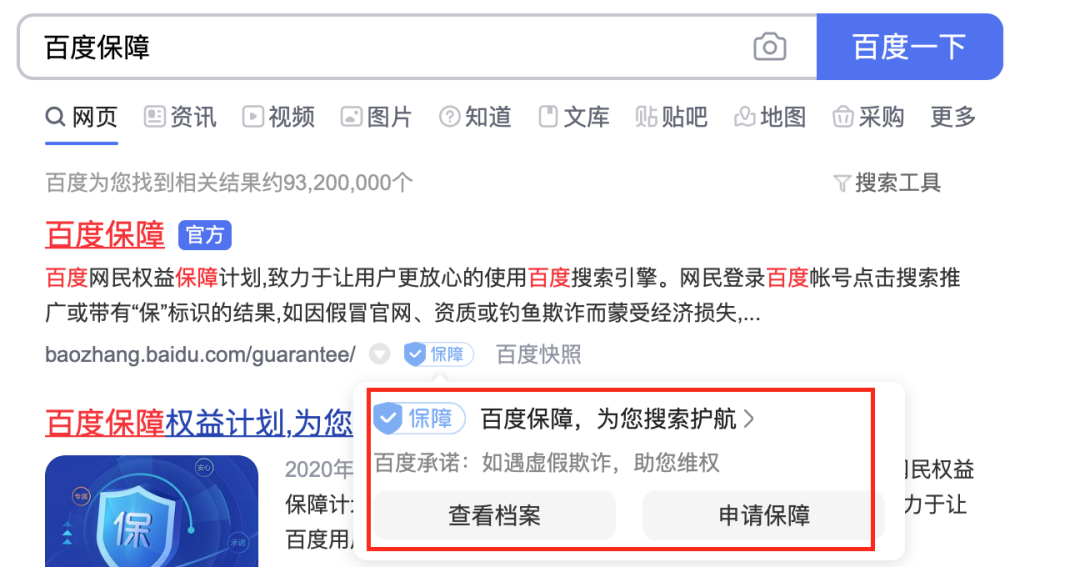 大家搜索信息時(shí)會(huì)發(fā)現(xiàn)一些添加“保障”標(biāo)識(shí)的網(wǎng)站排在前面,當(dāng)面對(duì)多條相似的搜索結(jié)果時(shí),更能夠吸引用戶的關(guān)注,往往會(huì)選擇該標(biāo)識(shí)的網(wǎng)站。該標(biāo)識(shí)是由百度保障發(fā)起,為防止大家受騙維護(hù)網(wǎng)民權(quán)益,旨在為網(wǎng)民創(chuàng)造一個(gè)更具保障性和安全性的網(wǎng)絡(luò)搜索環(huán)境。