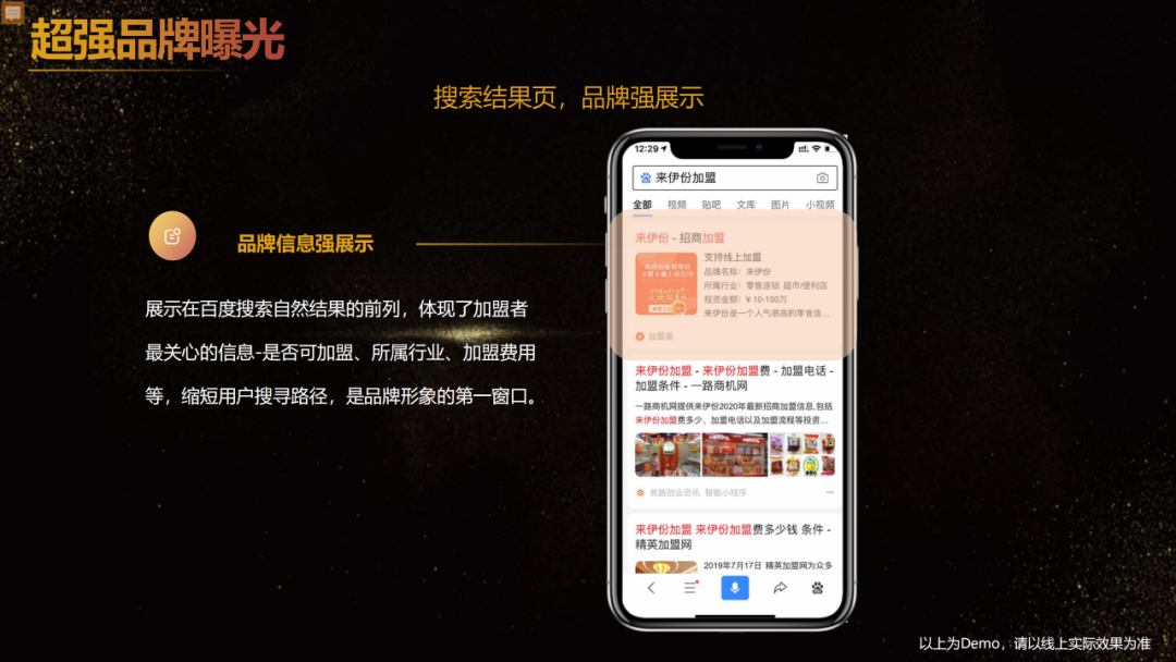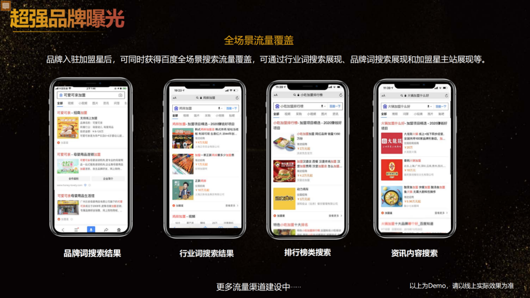 1、超強品牌曝光:多場景搜索流量覆蓋,通過搜索行業詞、品牌詞等多元需求詞為加盟項目及站內導流,獲得海量曝光,快速占領創業者心智;