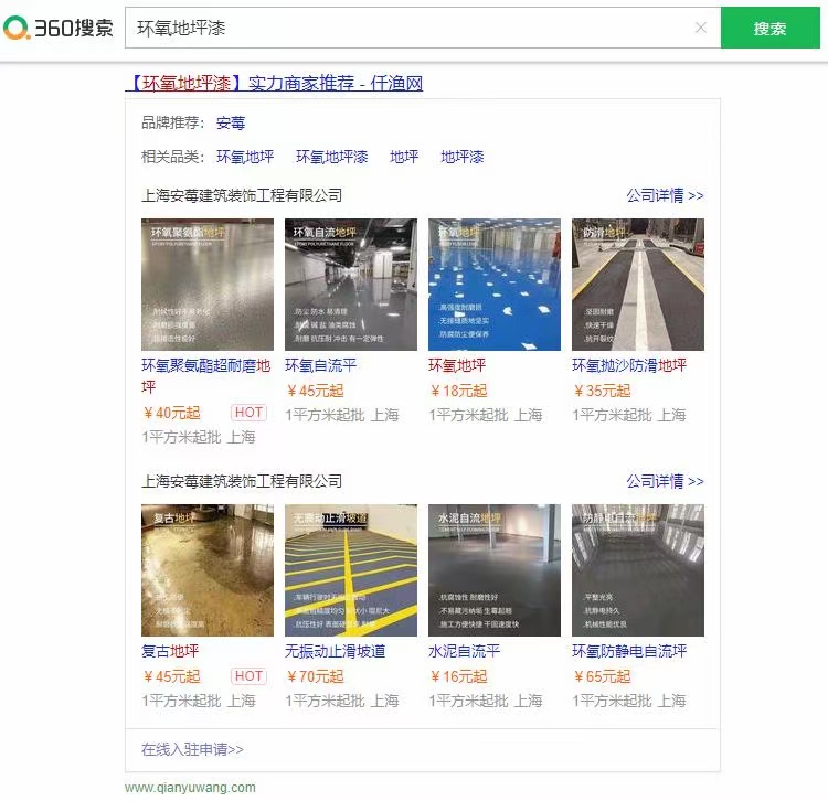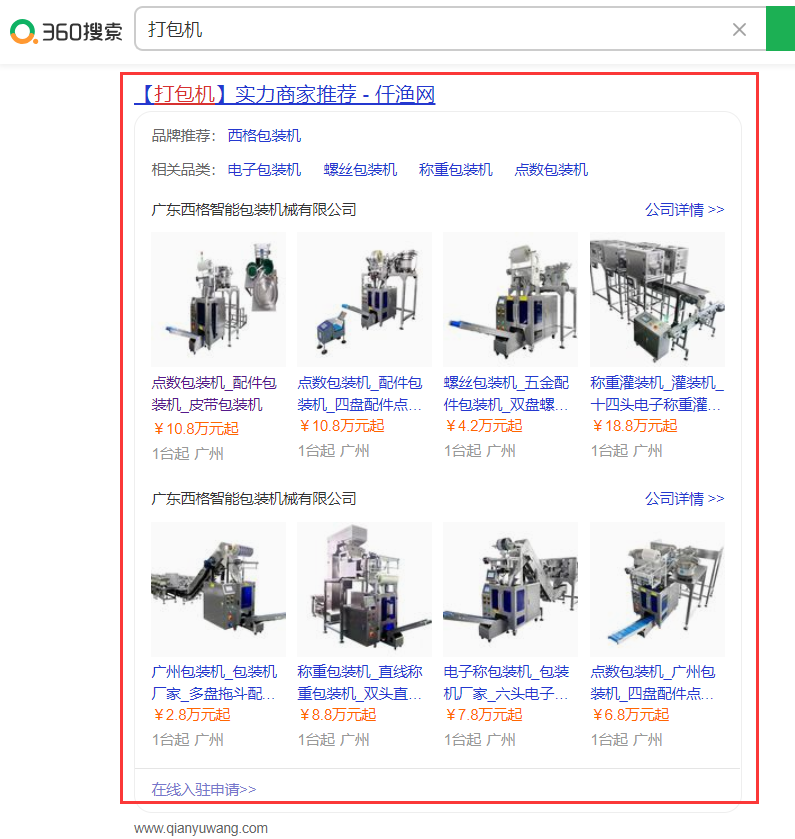 電腦端移動端同步,一次合作,多終端陣地展現,無論通過什么渠道,在360引擎搜索關鍵詞的時候(如360搜索“油性防火涂料”、“點焊機”、“防靜電abs”等),首頁展現如下圖的卡片形式,包含“品牌”、“相關品類”、“公司名”、“產品圖片”、“產品信息”、“價格”等,點開后為具體的詳情介紹。
